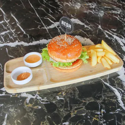 Nesh özel sos, cheddar peyniri, karamelize soğan, közlenmiş patlıcan, ketçap, mayonez. Patates kızartması ile